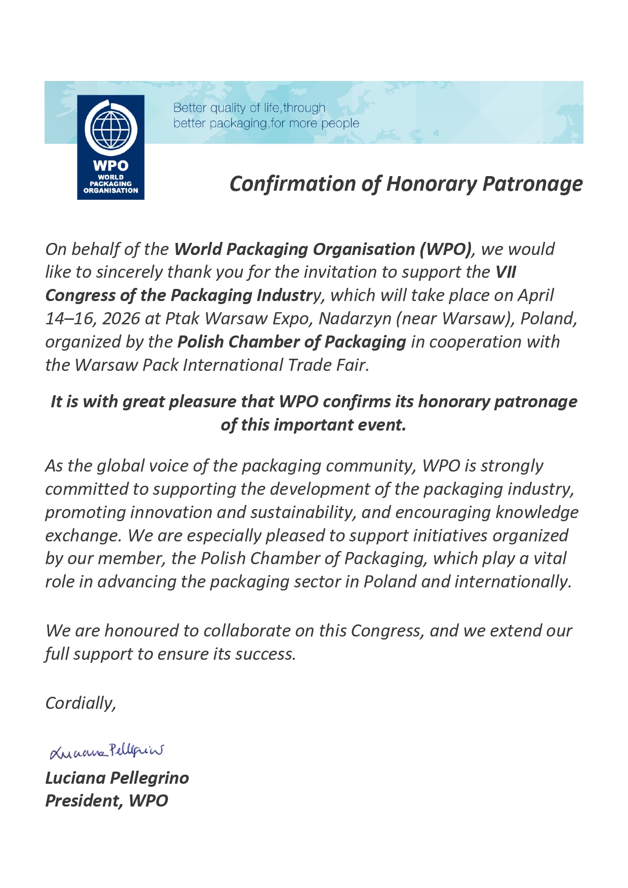 Luciana Pellegrino, Prezydent WPO, potwierdziła patronat i wygłosi wystąpienie otwierające Kongres pt. „Global Packaging Perspectives”, w którym odniesie się do kluczowych wyzwań globalnego rynku opakowań — od transformacji regulacyjnej, przez innowacje technologiczne, po konkurencyjność i odpowiedzialną komunikację środowiskową.